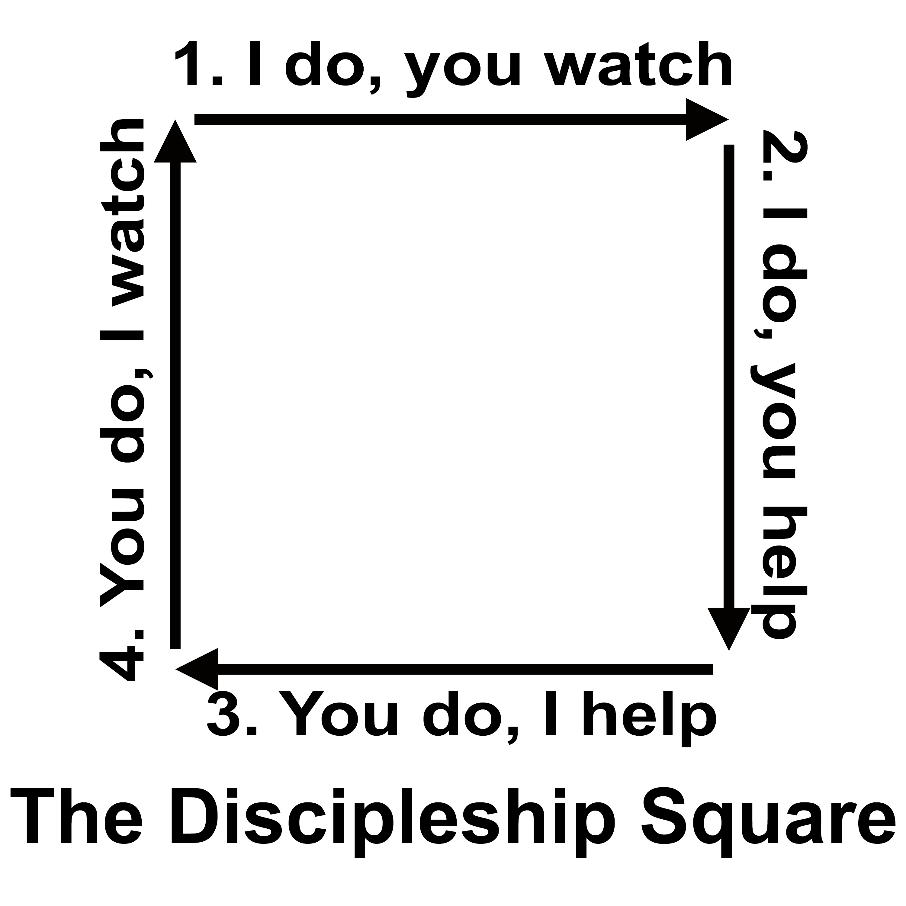 We see this same model with Jesus. He teaches the disciples. Then he gives them responsibilities under close supervision, debriefs and corrects them, then gives greater responsibilities. Mike Breen illustrates the four steps of this process in his Discipleship Square -- (1) I do, you watch; (2) I do, you help; (3) you do, I help; (4) You do, I watch.